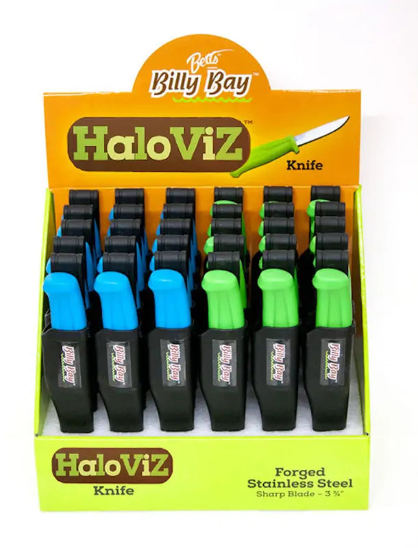 Bett's Billy Bay Hiviz 30 Knife Display 3.75" Stainless Steel 15 Blue and 15 Green. Beautiful Point of purchase display designed to create sales with 30 HiViz Knives - 15 HiViz Blue, 15 HiViz Green. 3.75" stainless steel flexible blade with molded sheath. Super great price. Each piece with UPC code.