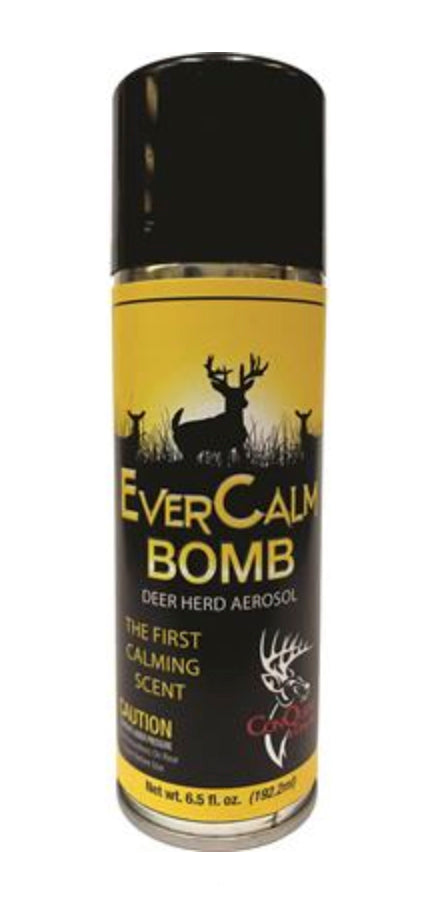 Conquest Game Scent Ever Calm Bomb. Strong, natural cover scent for the whitetail deer hunter. Contains all the scents and smells that whitetail deer produce while in their bedding area. 6.5 oz aerosol.