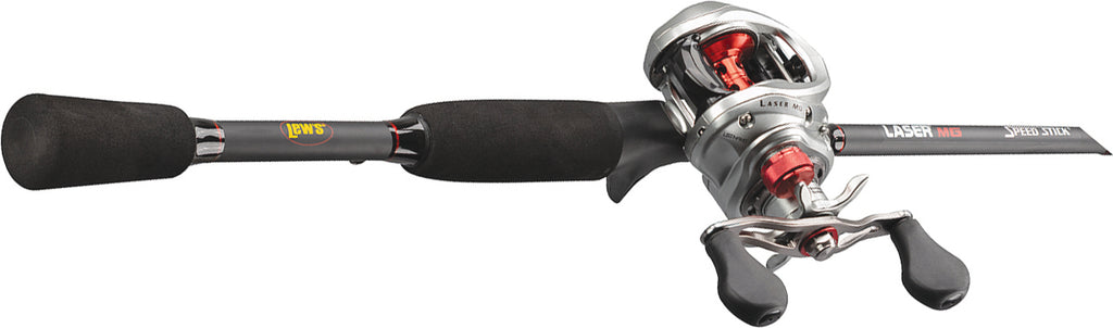 The 8-ball bearing Laser MG baitcast reel features a one-piece, lightweight graphite frame and sideplates. The palming sideplate is quick and easy to remove for immediate access to the spool. The heart of the reel is the solid brass SpeedGears cut on precision Hamai gear hobbing machines. A durable Rulon drag system delivers up to 15 lbs. of drag power, with adjustments made easily using the bowed graphite star located next to the handle. The rod features Lew’s proprietary skeletal graphite reel seat to keep the reel secure and in place without jeopardizing sensitivity. The rod’s EVA split grip handle reduces weight and makes for all-day fishing comfort. A patented “No Foul” hook keeper stays out of the way during casts and retrieves, but on the ready to safely secure a hook or lure when not in use.